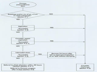 This document discusses the diagnosis and treatment of primary and secondary spontaneous pneumothorax. Primary pneumothorax typically occurs in young, healthy individuals and is usually treated initially with observation or simple aspiration. Secondary pneumothorax occurs in the context of underlying lung disease and may require chest tube drainage. Treatment depends on factors such as pneumothorax size and severity of symptoms. Surgical intervention is recommended for recurrent or persistent cases.