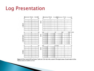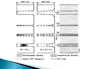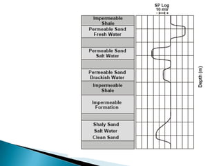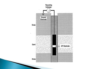 This document summarizes the spontaneous potential (SP) log. It discusses how SP works by measuring the natural potential difference between a downhole electrode and surface reference electrode. SP response is caused by salinity differences between borehole fluid and formation water. The document outlines the various SP potentials, how the tool works, factors affecting response, and applications for formation evaluation and correlation. SP provides a qualitative indicator of permeability but is not quantitative.