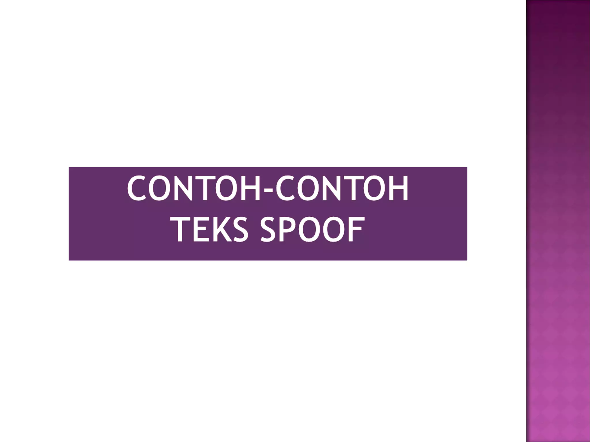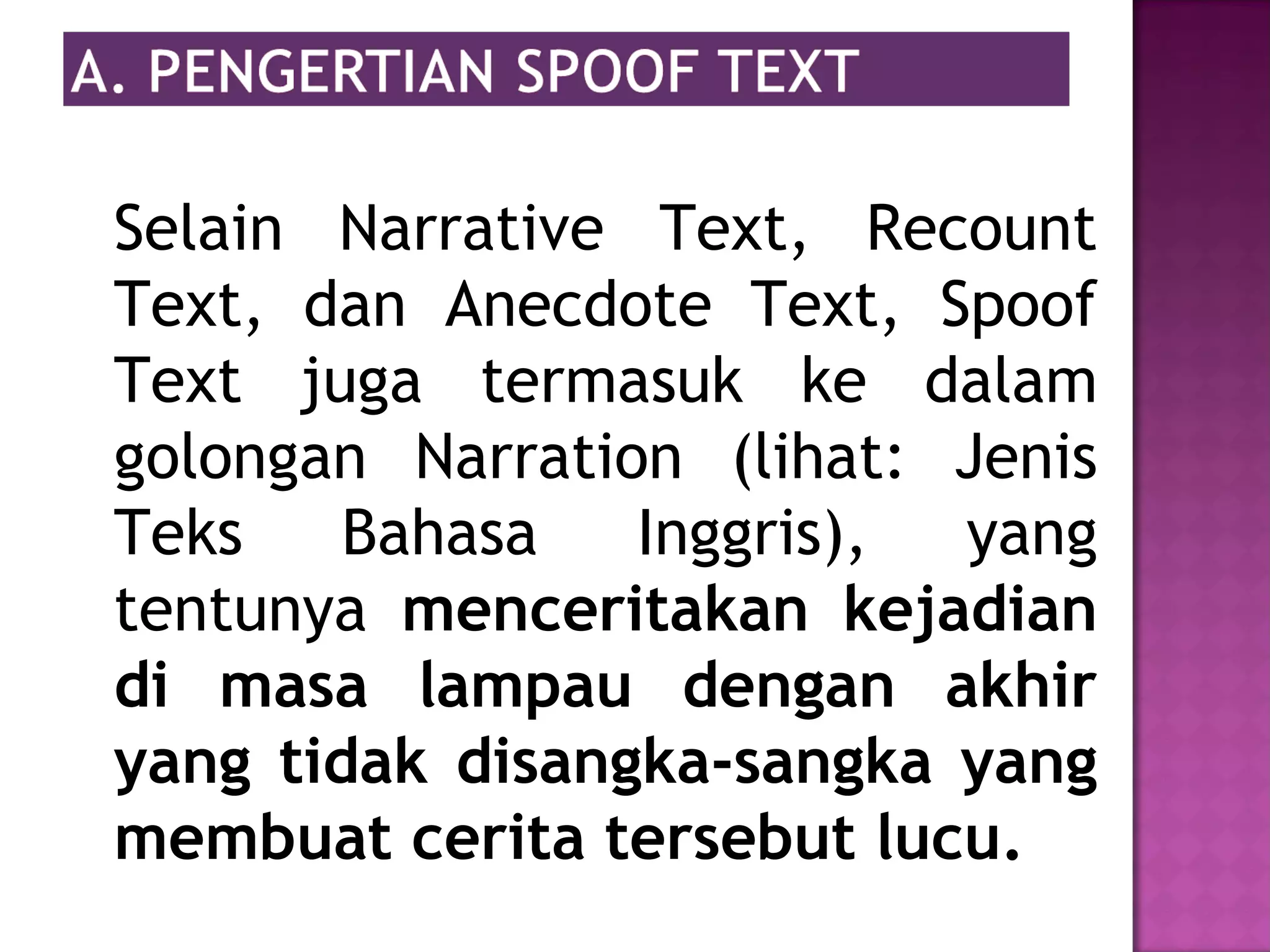 The document discusses the structure and characteristics of Spoof Text, a type of narrative text in English. Spoof Text aims to entertain readers with an unexpected twist or funny ending. It typically has three parts: 1) Orientation, which introduces the story, 2) Events, describing normal events, and 3) Twist, revealing an amusing reversal of the normal events. Some characteristics of Spoof Text include use of past tense verbs, action verbs, time/place adjectives, and chronological order. Examples of Spoof Text are provided to illustrate the three-part structure.