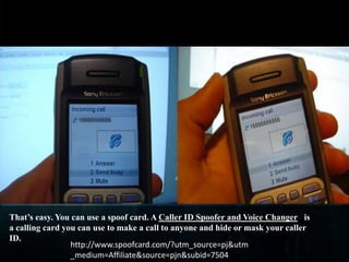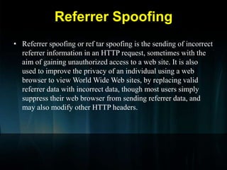 IP spoofing involves altering packet source IP addresses to hide the identity of the actual source. URL and referrer spoofing tricks users into thinking they are visiting legitimate sites when they are actually being directed to fake sites controlled by attackers. Caller ID spoofing allows callers to hide their real numbers. Email address spoofing modifies email headers to make emails appear to be from someone other than the actual sender. Spoofing techniques are commonly used by hackers and spammers to conceal their identities and gain illegitimate access.