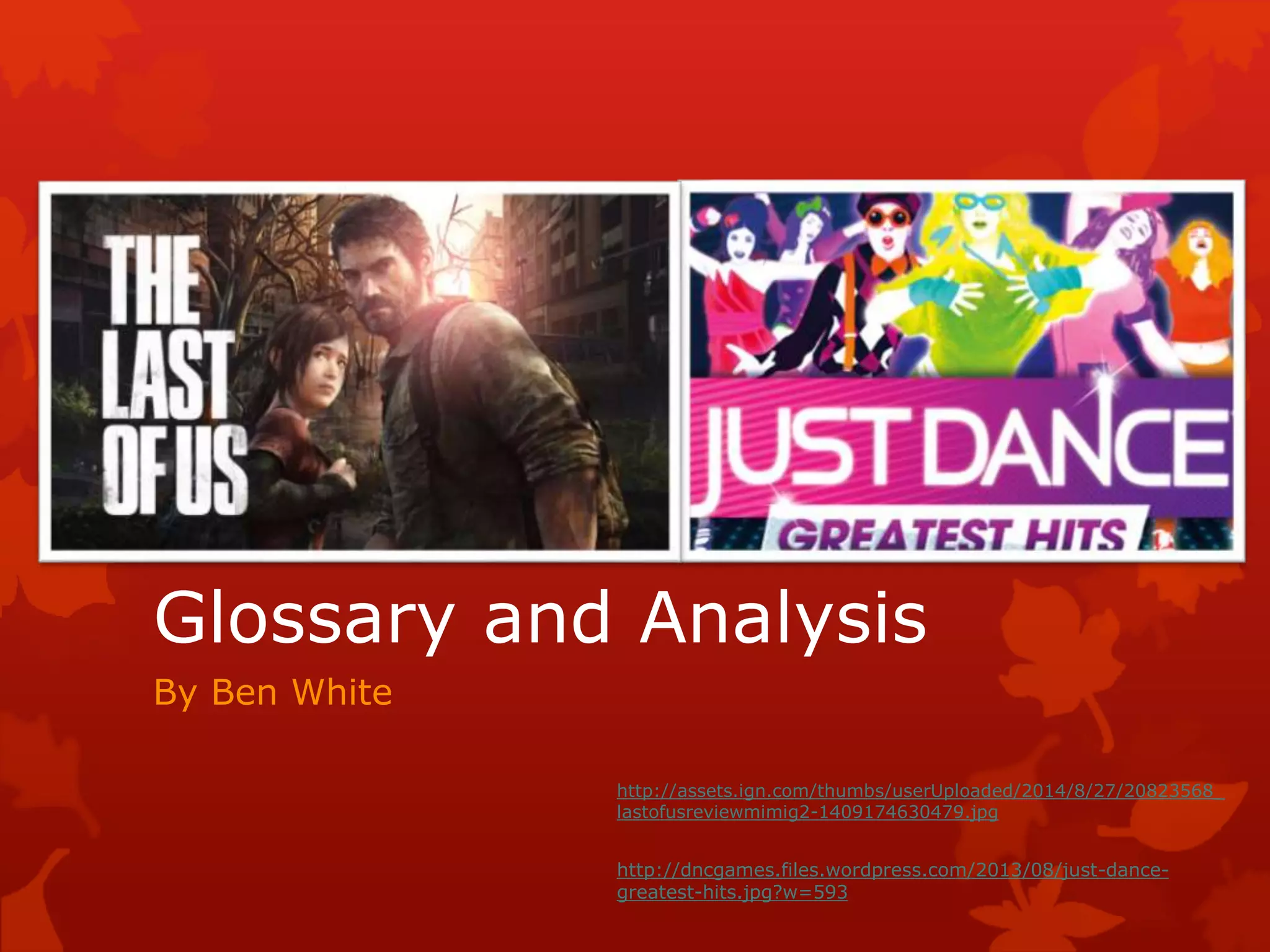 The document provides definitions and analysis of key media concepts including media text, semiotics, genre, content, construction, codes and conventions, modes of address, and target demographic. It analyzes movie posters and game covers for Batman Begins, The Last of Us, and Just Dance to illustrate how these concepts can be applied, noting differences in tone, themes, and intended audiences between the survival-horror game and dance party game.