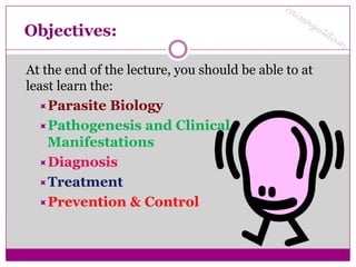 The document discusses various sporozoan parasites including Sarcocystis, Cryptosporidium, Toxoplasma, Eimeria, Isospora, and Plasmodium species. It provides details on the parasite biology, life cycles, pathogenesis, clinical manifestations, diagnosis, treatment and prevention of diseases caused by these sporozoans. Key points covered include that sporozoans are obligate parasites with complex life cycles involving sexual and asexual reproduction, and they cause diseases by infecting tissues through ingestion of infective stages such as oocysts or sporocysts.