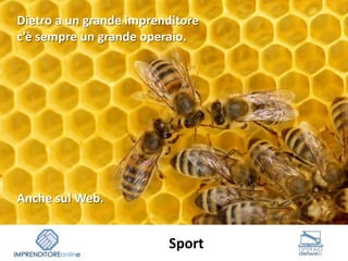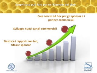 Il documento descrive l'importanza del 'operaio del web' nel settore sportivo, evidenziando il suo ruolo nella creazione di servizi per sponsor e partner, gestione dei social media e costruzione di comunità di tifosi. Sottolinea la necessità di una strategia integrata per la reputazione online e la gestione dei contenuti. Infine, si presenta come un laboratorio di marketing digitale con dettagli di contatto.