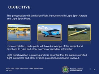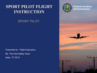 This presentation provides an overview of sport pilot flight instruction. It discusses the establishment of the light sport category and sport pilot certificate in 2004. It outlines the aircraft categories that fall under light sport aircraft and the certification processes. It covers the medical requirements, aeronautical experience requirements, privileges and limits of sport pilots compared to private pilots. It discusses who can provide instruction to sport pilots and requirements for flight instructors and sport pilot instructors. It also addresses considerations for transition training when pilots with prior experience move to light sport aircraft.