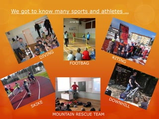 The document describes a variety of sports and games that were part of a project year, including footbag, mountain rescue team, bowling, connect four, mikado, sound memory, ekec pekec, mini football, hacky bags, lacrosse, gummistwist, labyrinth, fishing, and storyteller. Students got to know many athletes and sports, made games and accessories, and participated in different recreational activities.