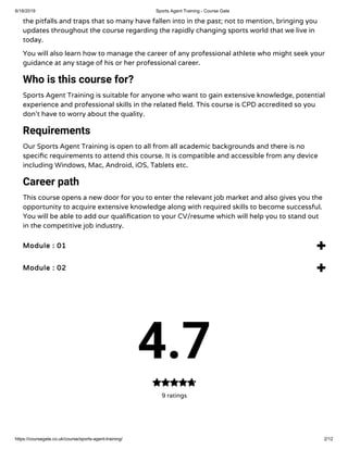 The sports agent training course is designed for individuals aspiring to become sports agents and those interested in the sports industry, offering essential skills to guide athletes in critical career decisions. It covers the athlete's career stages, the pitfalls of the profession, and is CPD accredited to ensure quality. The course is accessible on multiple devices, requires no specific academic background, and can enhance job prospects in the competitive sports market.
