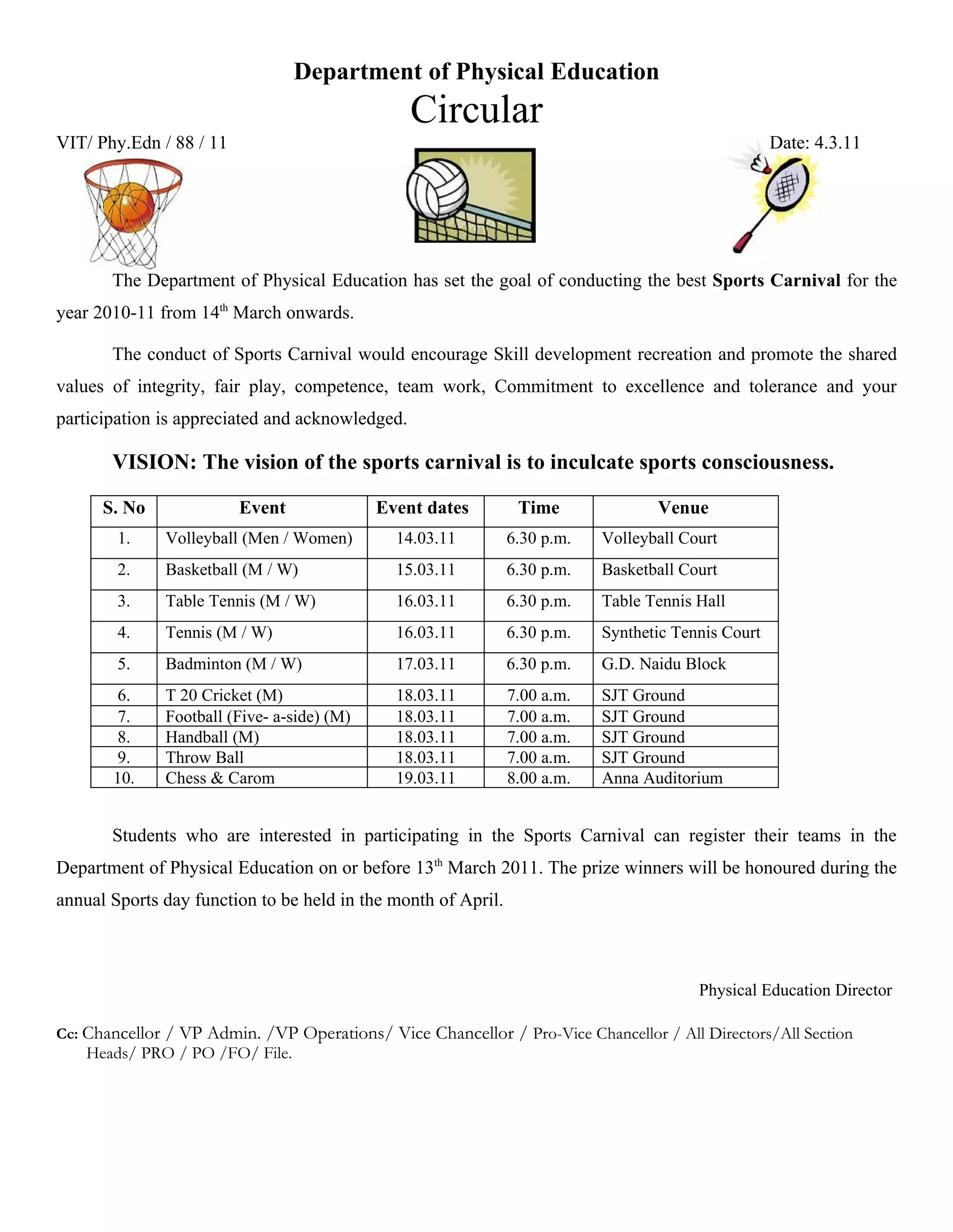 The Department of Physical Education has set a goal to host the best Sports Carnival for the 2010-2011 year from March 14th onwards. A variety of sporting events will take place from March 14th to 19th including volleyball, basketball, table tennis, tennis, badminton, cricket, football, handball, throw ball, and chess & carom. Students interested in participating must register their teams with the Department of Physical Education by March 13th. The winners will be honored at the annual Sports Day function in April.