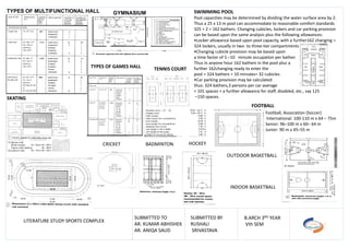 The document outlines the key components and facilities required for a sports complex. It should include a stadium for sports like football and rugby, an indoor stadium for basketball and swimming, and dedicated facilities for cricket and hockey. Additional requirements include changing rooms, seating for at least 2,000 spectators, parking, and first aid rooms. The complex must also allow for safe evacuation from stands and comply with accessibility regulations. A variety of sport-specific requirements for courts, pools, and fields are also outlined.