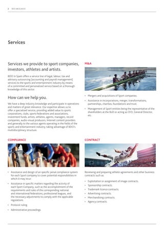 BDO Abogados provides legal, tax, labour, and advisory outsourcing services to sports and entertainment companies in Spain. Their services include reviewing contracts, mergers and acquisitions advice, compliance support, dispute resolution, intellectual property protection, and accounting/payroll services. They have experts in legal, corporate, tax, and labour issues facing the sports and entertainment industries.