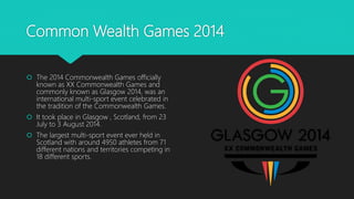 This document summarizes India's performance at the 2014 Asian Games, 2014 Commonwealth Games, and 2010 Commonwealth Games based on the number of medals won and India's position in the overall medal tally. At the 2014 Asian Games, India finished 8th place overall and won a total of 57 medals including 11 gold, 10 silver, and 36 bronze. At the 2014 Commonwealth Games, India finished 5th place and won 64 total medals comprising of 15 gold, 30 silver, and 19 bronze. The document also compares India's medal counts between the 2010 and 2014 Commonwealth Games across various sports.