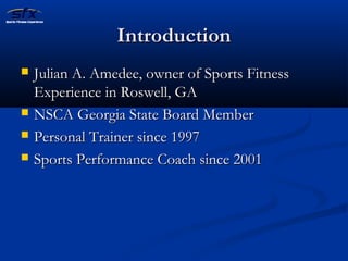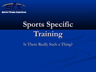 This presentation defines my views that there is no such thing as sports specific training when it comes to sports performance. Athletes from different sports can train together and get the benefits from working on the same drills and exercises. What they need to learn is how each specific drill pertains to their sport. In a whole there is not one drill or exercise that is specific to one particular sport unless the drill contains aspects of that sport.