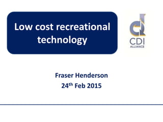 This document discusses low cost recreational technology options that use existing technology in new ways. It focuses on exergaming which uses video games to encourage physical activity through sports simulations, digital coaches, and virtual opponents. Specific examples mentioned include apps for video analysis of sports sessions and planning workout routines. The intended audience is those interested in affordable technologies for recreation and health.