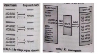 System programming involves developing software like operating systems, compilers, linkers, and device drivers. Key components of systems programming evolution include text editors, assemblers, macros, compilers, interpreters, loaders, linkers, debuggers, and device drivers. Assemblers translate assembly language into machine code. Macros allow frequently used code sequences to be defined once and reused.