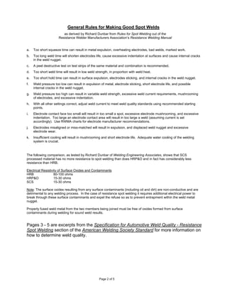 This document provides guidelines for spot welding SCS processed steel. Testing showed that SCS steel is suitable for resistance welding and has better weldability than hot-rolled black steel. Spot welding SCS requires regular electrode cleaning to prevent oxide buildup. Electrode life is equivalent when welding SCS or hot-rolled pickled and oiled steel. The document provides starting parameters for resistance spot welding SCS steel and general rules for making good spot welds. Electrical resistivity testing showed SCS has similar resistivity to hot-rolled pickled and oiled steel and less than hot-rolled black steel.