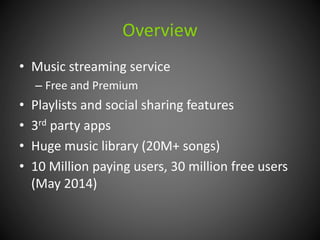Spotify is a music streaming service that offers both free and premium subscriptions. It has a huge music library of over 20 million songs. While it has over 40 million total users, 10 million are paying subscribers. Spotify generates revenue through subscriptions and advertising, but still operates at a loss due to high royalty payments to music labels and artists. It was founded in 2006 in Sweden and has since expanded globally, partnering with companies like Uber to help drive growth.