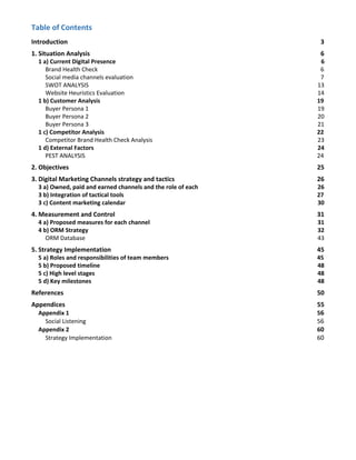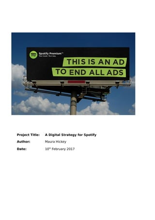 The document outlines a digital strategy for Spotify, including a situation analysis of its digital presence, customer analysis, and competitor analysis. Key findings highlight the strengths and weaknesses of Spotify's social media channels, content strategy, and user engagement, as well as buyer personas representing different customer segments. The strategy also proposes objectives, marketing tactics, and implementation measures to enhance Spotify's brand visibility and user interaction across various platforms.