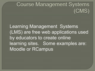 Online learning in K-12 schools provides benefits to various types of students and teachers. Learning management systems like Moodle and RCampus allow flexible, personalized learning and help develop 21st century skills. They can replace outdated textbooks, provide enrichment and remediation, and accommodate different learning styles and abilities. Teachers benefit from less paperwork and increased collaboration, while students gain access to global connections, tutoring, and opportunities to learn outside of school. However, some concerns remain about fully implementing online learning.