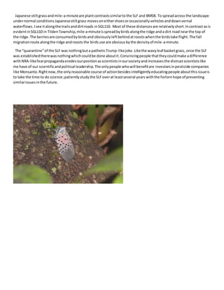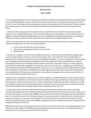The document details Richard Gardner's observations of the spotted lanternfly (SLF) in Berks County, PA, highlighting its spread in suburban and urban areas due to its habit of hitching rides on vehicles. Gardner shares his findings from various locations and contrasts the SLF with the brown marmorated stink bug, noting significant differences in their reproductive rates and spread mechanisms. He expresses concerns about the effectiveness of quarantine measures and stresses the importance of scientific study and public education regarding the SLF's impact.