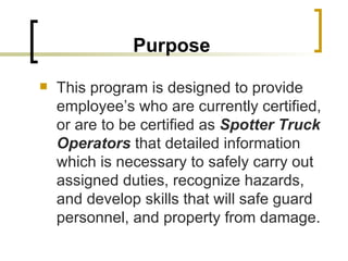 This document outlines procedures for spotter truck operators to safely inspect and operate their vehicles. It describes conducting a daily vehicle inspection to check for issues with tires, wheels, brakes, steering, suspension and other components. The inspection process includes approaching the vehicle, reviewing past reports, checking fluids and controls, lights, signals and performing a walk around check. Operators are instructed on how to properly accelerate, steer, back up and use basic vehicle controls. Backing safety is emphasized, including using helpers and mirrors and turning the steering wheel in the appropriate direction depending on the vehicle.