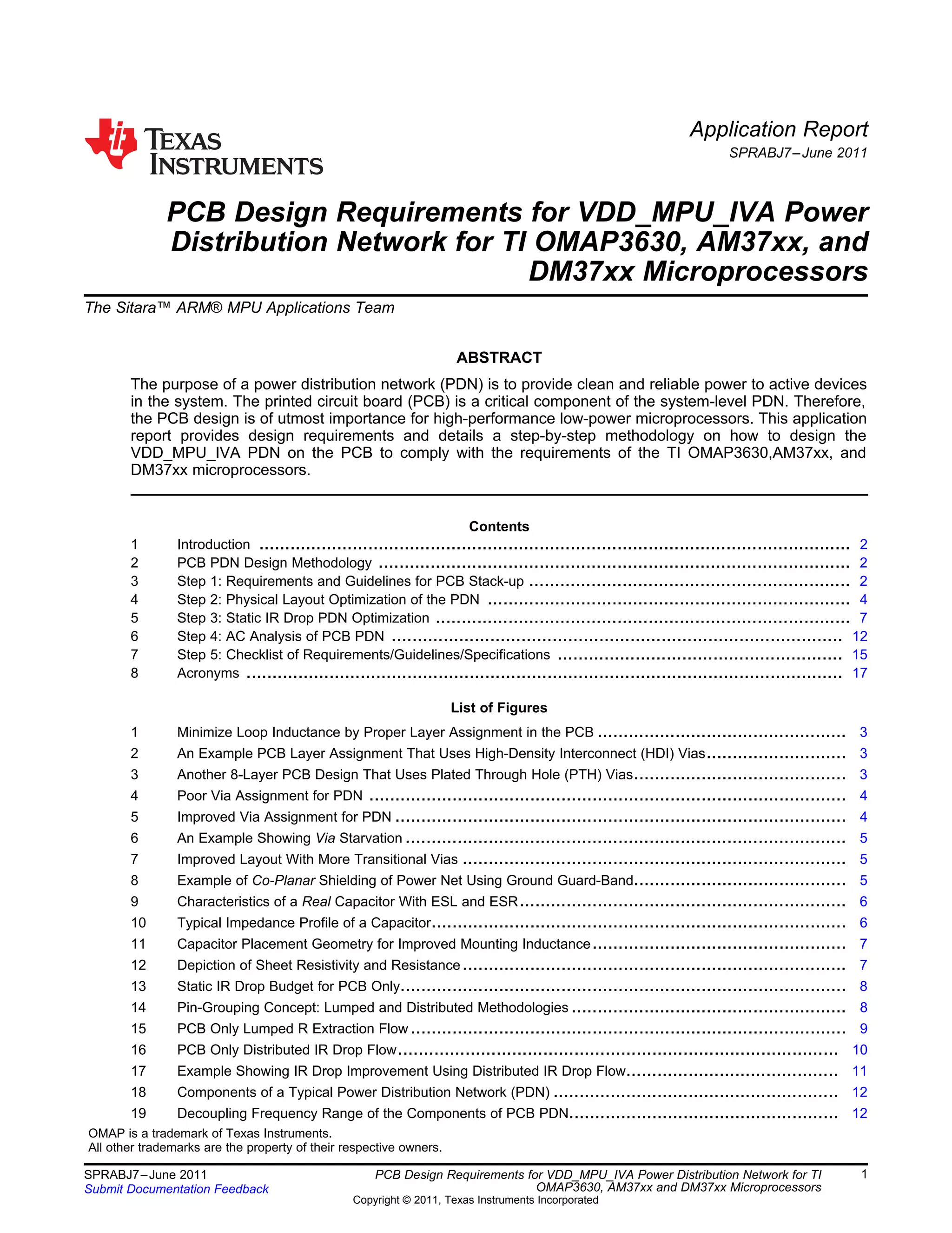 This document provides guidelines for designing the printed circuit board (PCB) power distribution network (PDN) for TI OMAP3630, AM37xx, and DM37xx microprocessors. It outlines a 5-step methodology: 1) Requirements for the PCB stackup, 2) Optimizing the physical layout, 3) Static IR drop analysis, 4) AC analysis, and 5) Design checklist. Key recommendations include closely coupling power and ground planes, minimizing dielectric thickness, and optimizing via and trace routing to reduce parasitic inductance and improve high-frequency performance.