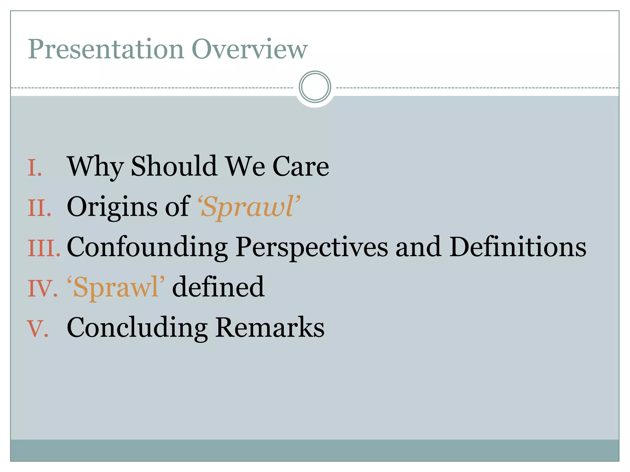 This document discusses the definition and measurement of urban sprawl. It begins with an overview of the origins of the term "sprawl" in the 1930s and its popularization in the 1950s. It then examines conflicting perspectives on sprawl and various definitions from different organizations. The document proposes defining sprawl based on eight dimensions: density, continuity, concentration, clustering, centrality, mixed-uses, and proximity. These dimensions can be quantified to objectively measure sprawl's characteristics in a given geographic area. The document concludes that defining sprawl objectively using land use characteristics can help planners make informed land use decisions.