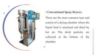 The document discusses spray drying as an essential process for transforming liquid feeds into dry powders, highlighting its historical evolution and versatile applications in food, pharmaceuticals, and chemicals. It details technical aspects such as efficiency factors, types of spray dryers, and recent advancements like computational modeling and automation integration. The conclusion emphasizes the need for continuous optimization and innovation to enhance energy efficiency and product quality in spray drying processes.