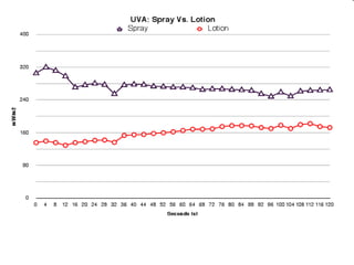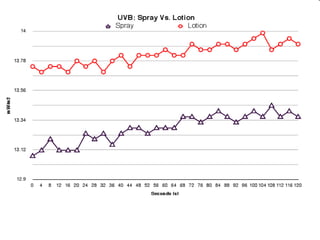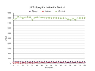 This document summarizes an experiment that tested the effectiveness of sunblock lotion versus spray at protecting against UVA and UVB radiation. The experiment found no significant difference between a spray and lotion with the same SPF value. Both provided much better protection than a control with no sunblock. The purpose was to determine if application method (lotion vs spray) made a difference in sun protection. Extensions are proposed to further compare sunblock products and educate students on sun safety.