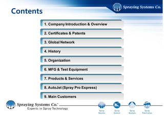 Spraying Systems Co., Korea specializes in manufacturing and providing over 87,000 different spray nozzles and systems, aimed at improving efficiency and product quality across various industries. The company, founded in 1994, has a global presence with ten manufacturing locations and numerous sales offices worldwide, offering tailored solutions and services like spray analysis and control systems. Key customers include Samsung Electronics, LG Display, and various steel and power companies.