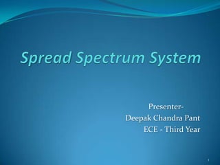 Spread spectrum is a communication technique that spreads a narrow band signal over a wide range of frequencies, enhancing resistance to interference and jamming. Key methods include direct sequence, frequency hopping, and hybrid techniques. It has applications in cellular telephony, GPS, and secure military communication.
