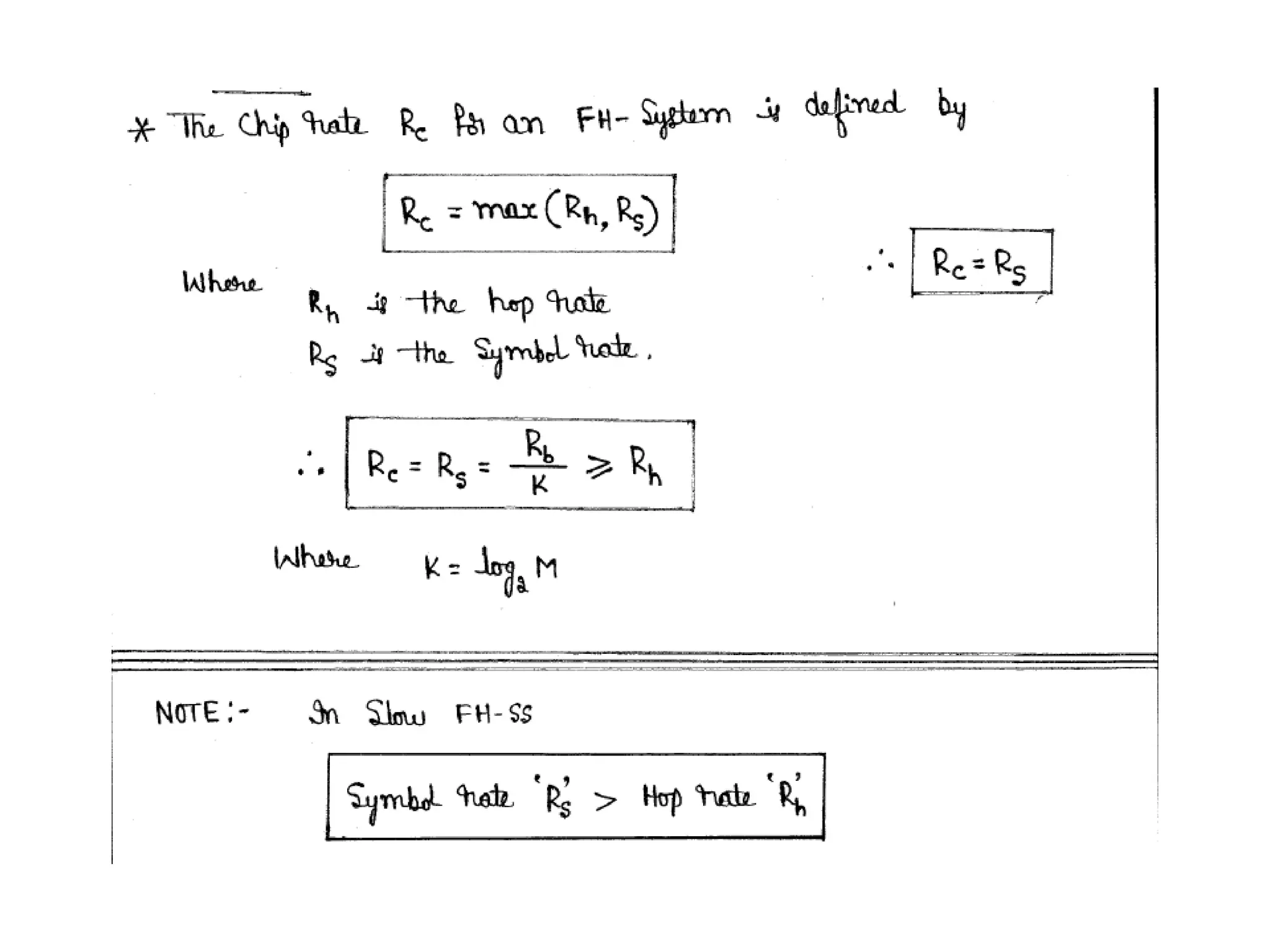 #48 A common modulation technique used in conjunction with FHSS is multiple FSK (MFSK), which uses M = 2L different frequencies to encode the digital input L bits at a time (see Chapter 5). For FHSS, the MFSK signal is translated to a new frequency every Tc seconds by modulating the MFSK signal with the FHSS carrier signal. The effect is to translate the MFSK signal into the appropriate FHSS channel. For a data rate of R, the duration of a bit is T = 1/R seconds and the duration of a signal element is Ts = LT seconds. If Tc is greater than or equal to Ts, the spreading modulation is referred to as slow-frequency-hop spread spectrum; otherwise it is known as fast-frequency-hop spread spectrum.