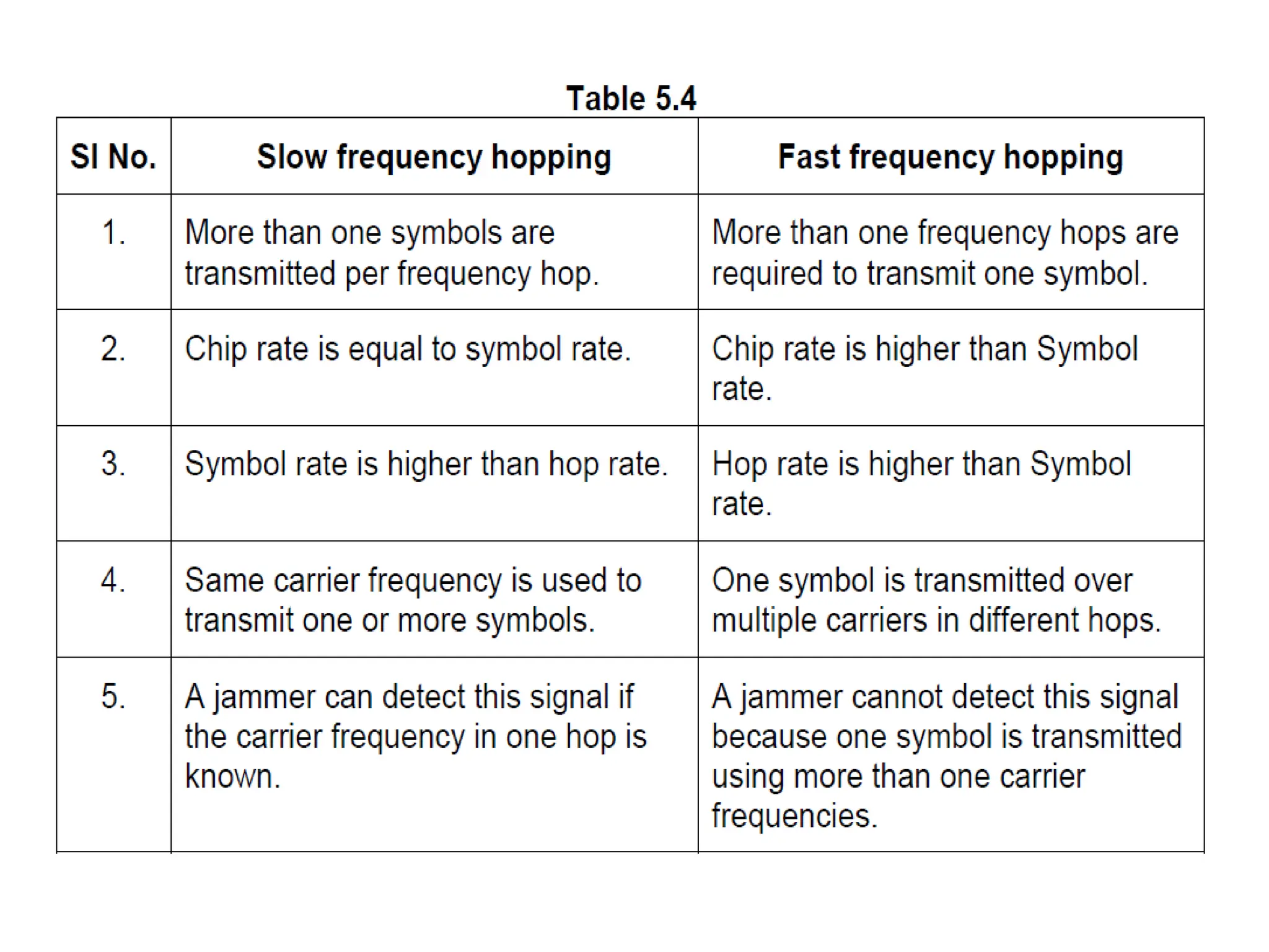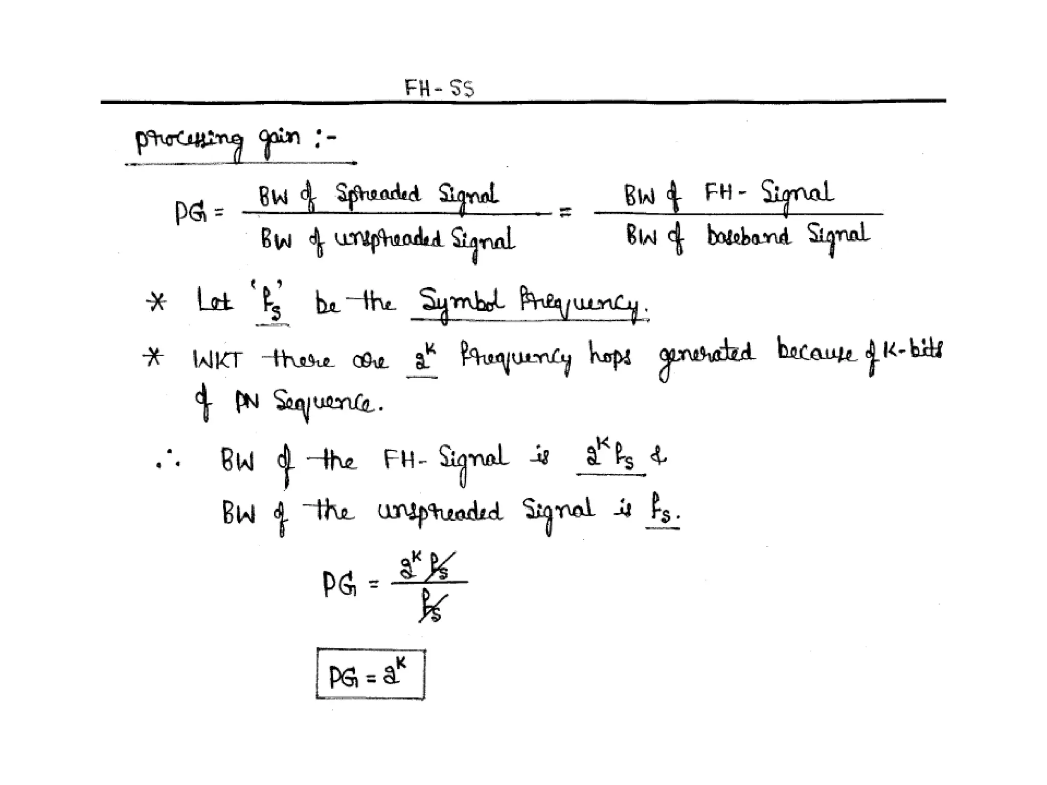 Typically, a large number of frequencies is used in FHSS so that bandwidth of the FHSS signal is much larger than that of the original MFSK signal. One benefit of this is that a large value of k results in a system that is quite resistant to jamming. If frequency hopping is used, the jammer must jam all 2k frequencies. With a fixed power, this reduces the jamming power in any one frequency band to Sj/2k. In general, fast FHSS provides improved performance compared to slow FHSS in the face of noise or jamming, as will discuss shortly.