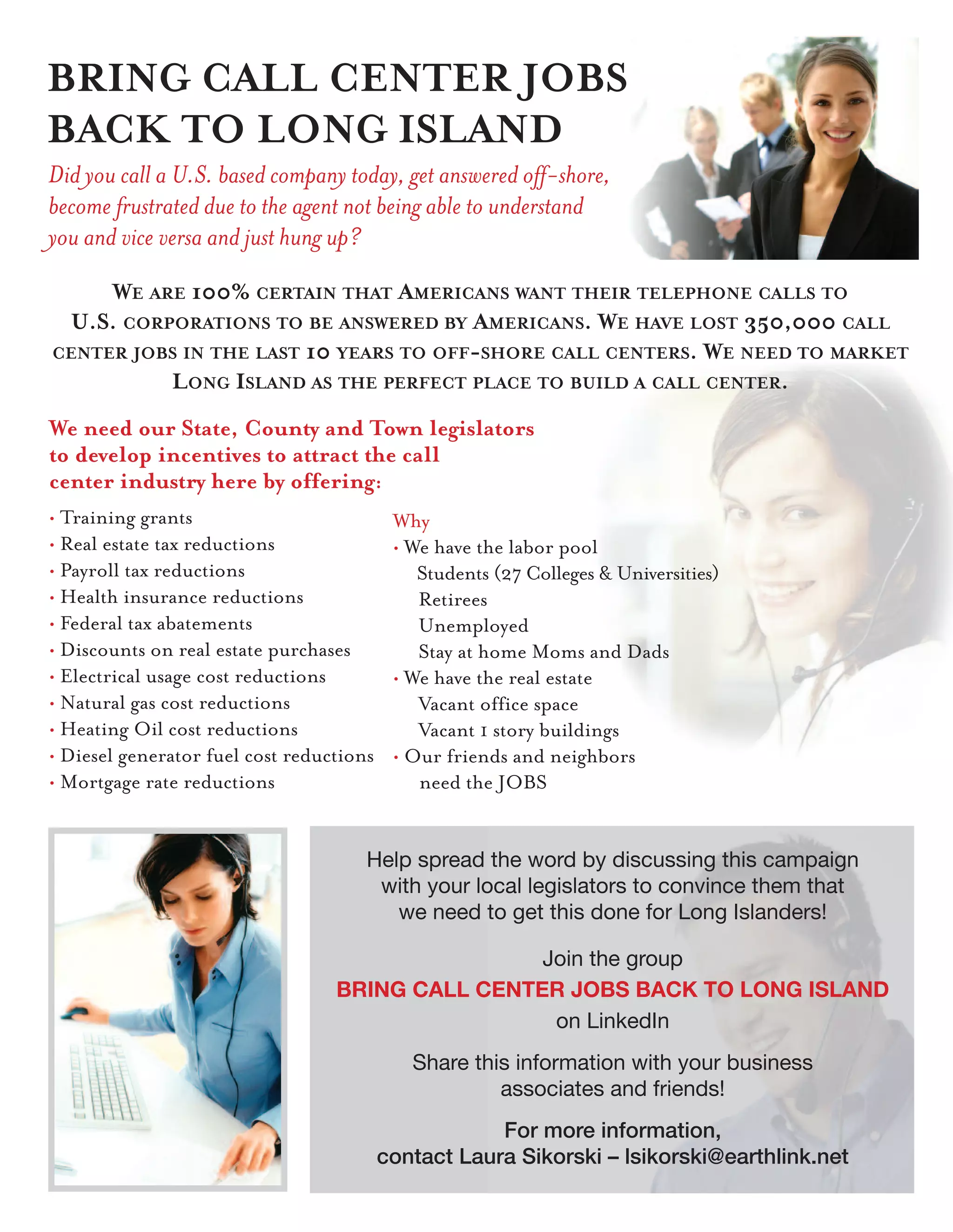 This document advocates bringing call center jobs back to Long Island from offshore locations. It notes that over 350,000 call center jobs have been lost in the last 10 years as companies have moved operations overseas. The document proposes that Long Island is well-suited for call centers due to available labor, office space, and incentives that could be offered like tax reductions, grants, and discounts on real estate and utilities to attract companies. It encourages contacting local legislators to promote adopting such incentives to create call center jobs in Long Island.