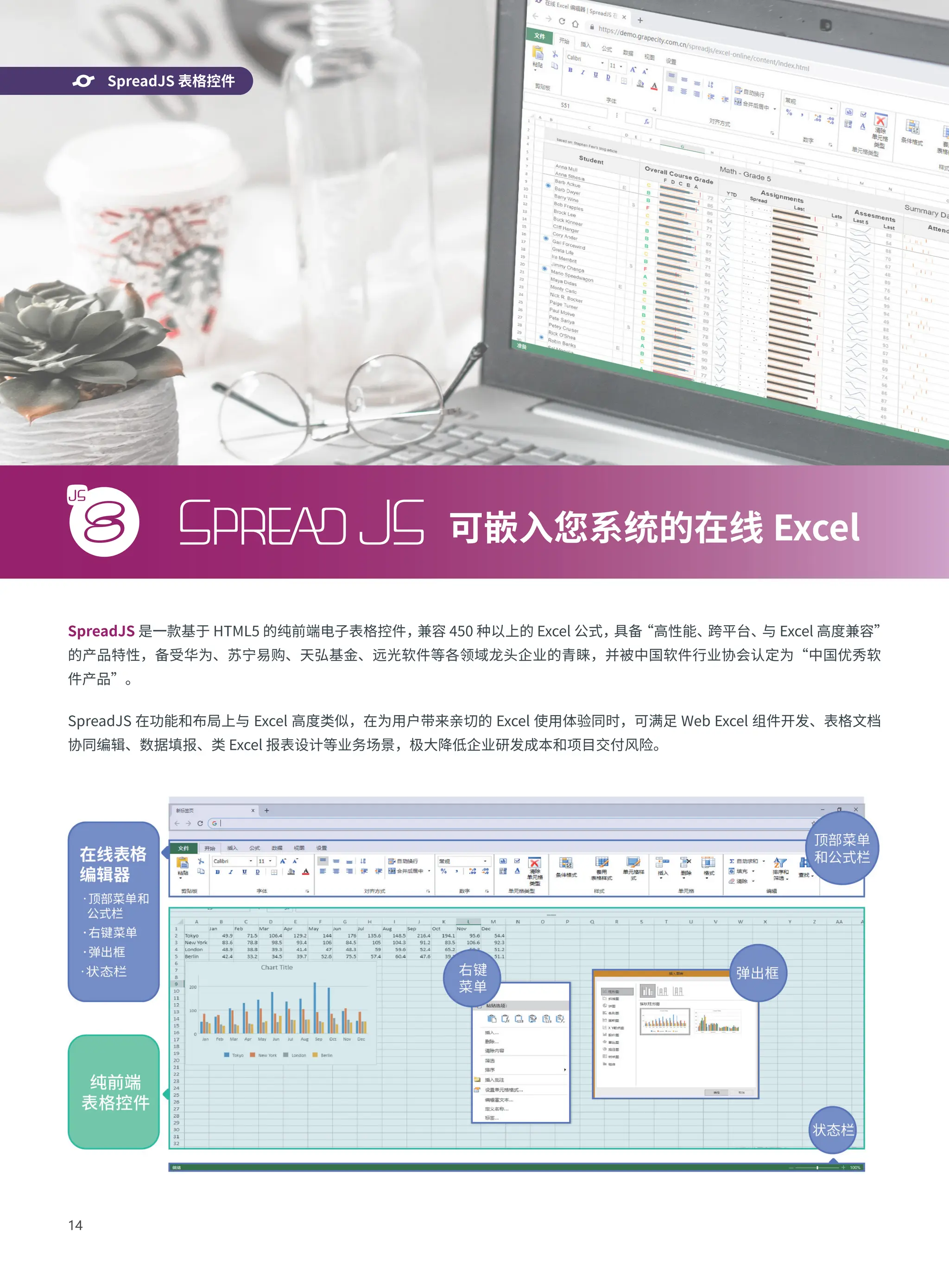 的纯前端电子表格控件, 兼容 450 种以上的 Excel 公式, 具备 “高性能、 跨平台、 与 Excel 高度兼容” 的产品特性,备受华为、苏宁易购、天弘基金、远光软件等各领域龙头企业的青睐,并被中国软件行业协会认定为“中国优秀软 件产品”。 SpreadJS 在功能和布局上与 Excel 高度类似,在为用户带来亲切的 Excel 使用体验同时,可满足 Web Excel 组件开发、表格文档 协同编辑、数据填报、类 Excel 报表设计等业务场景,极大降低企业研发成本和项目交付风险。 可嵌入您系统的在线 Excel SpreadJS 表格控件 SpreadJS 表格控件
