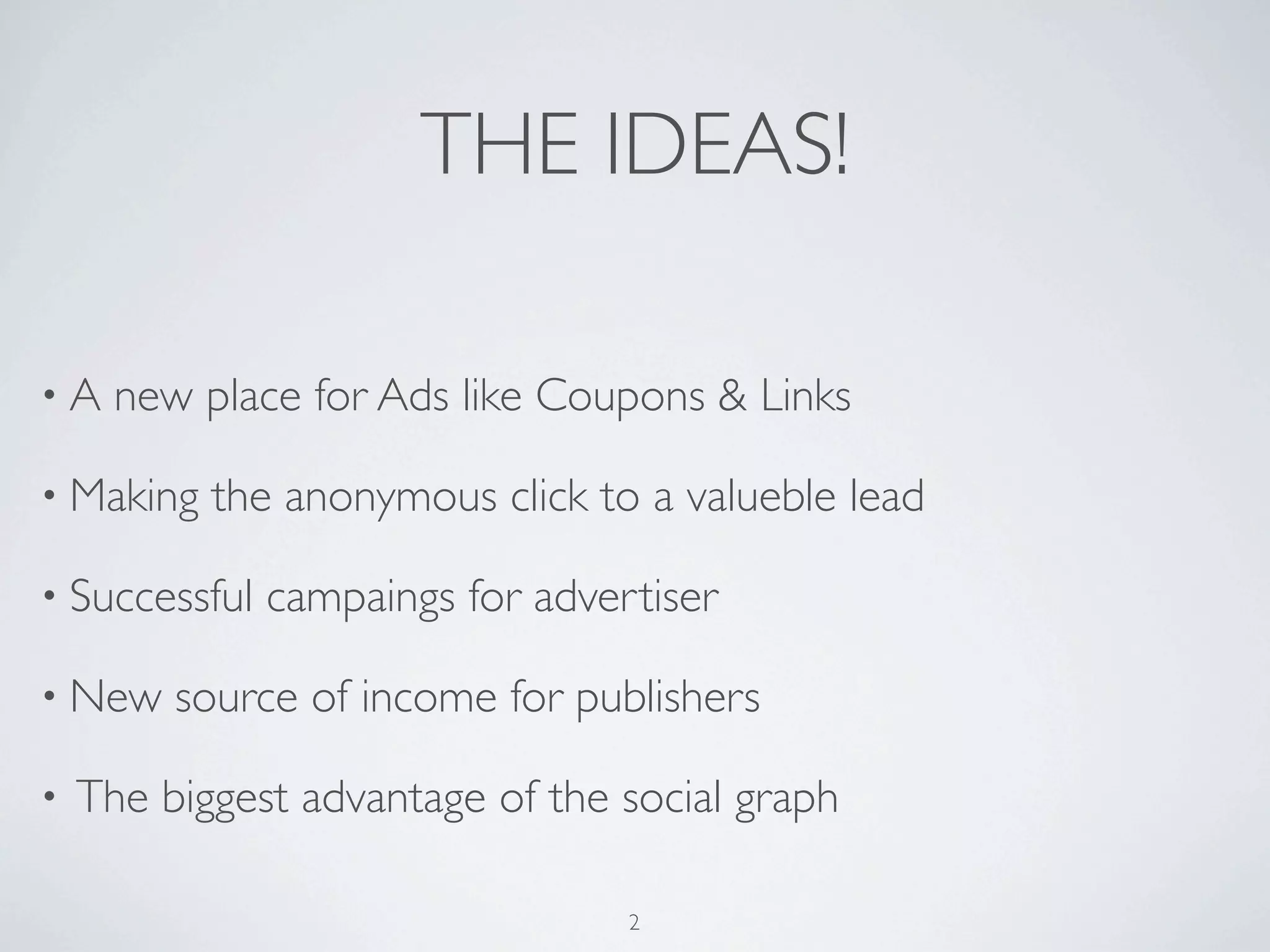 Spreadly.com is a social sharing ad-network that allows advertisers to place coupons and links and publishers to earn money by sharing content. It works by placing a small sharing button on publisher sites that drives traffic and leads with one click. Key features for publishers include driving audience and traffic from social shares, analytics on influencers, and earning money from visitor recommendations without legal risks. For advertisers, it provides an efficient place for banner ads and leads with just one additional click after someone shares content. The company is seeking partnerships to expand its button and exclusive ad campaigns to help it grow into an alternative to other social sharing platforms in Europe and globally.