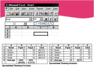 Spreadsheets allow users to enter data into a table with rows and columns and perform calculations automatically. Formulas and functions can be used to calculate values within cells. Data can be sorted, charts can be created from cell ranges, and cells or ranges of cells can be moved or copied.
