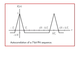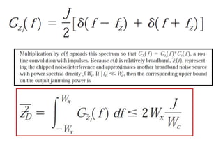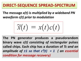 Direct-sequence spread spectrum techniques multiply a message signal by a pseudorandom noise code to spread the signal's bandwidth. At the receiver, synchronization of the local pseudorandom code allows recovery of the original message signal. Frequency-hopping spread spectrum transmits a message signal over multiple carrier frequencies according to a pseudorandom hopping sequence, making jamming or interception more difficult. The document describes the operation of direct-sequence and frequency-hopping transmitters and receivers, and discusses performance in the presence of interference and jamming.