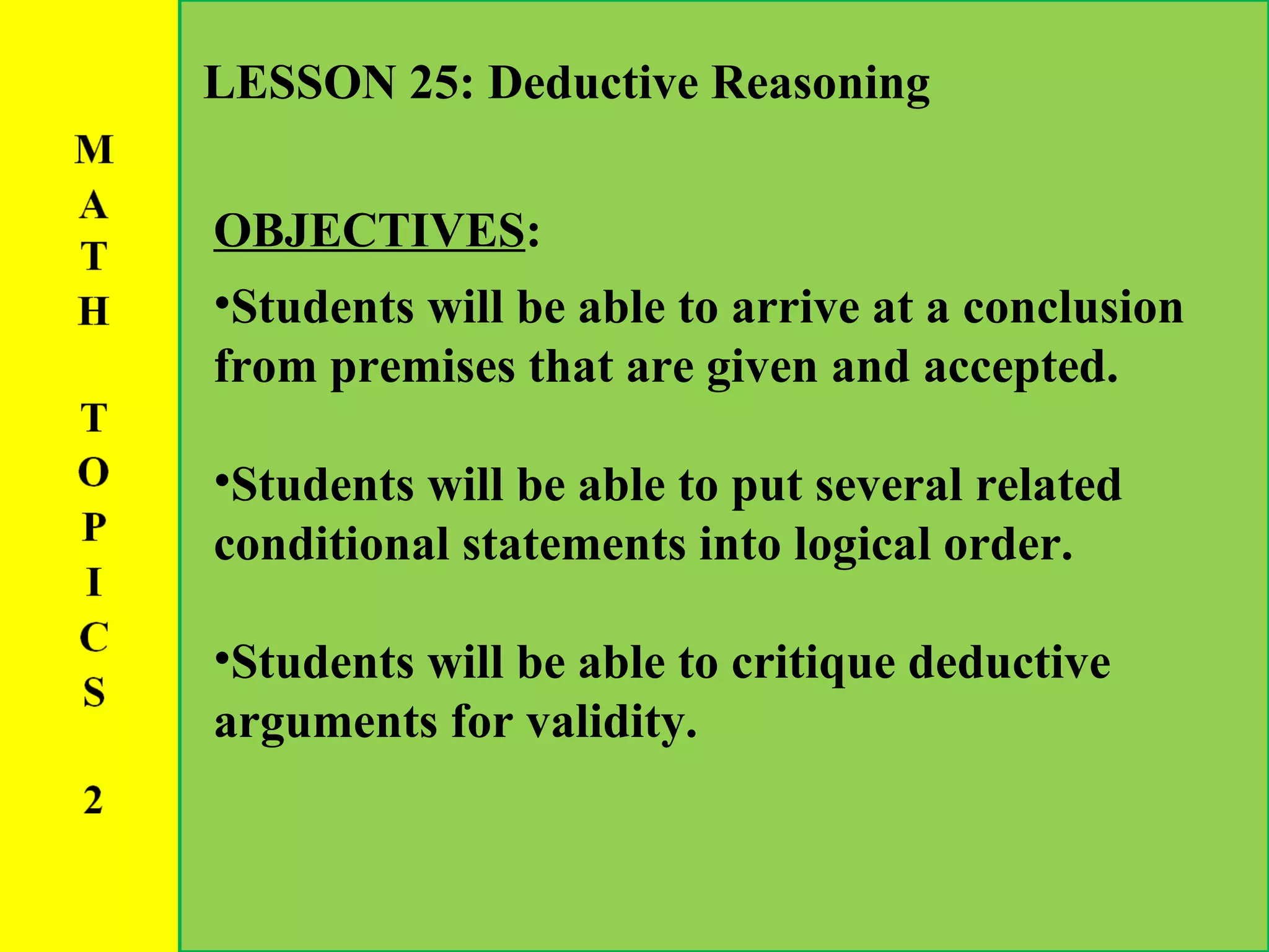 The document provides lesson content on deductive reasoning, including definitions of key terms like conditional statements, major and minor premises, validity, and critiquing arguments. It gives examples of forming conclusions using syllogisms and conditional statements. It also covers ordering related conditional statements logically and evaluating the validity of arguments. Students learn to derive converses, inverses, and contrapositives of conditional statements.