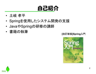 1 これからSpringを使う開発者が 知っておくべきこと 2018/10/31 日本Springユーザ会 土岐 孝平 ハッシュタグ: #sf_11