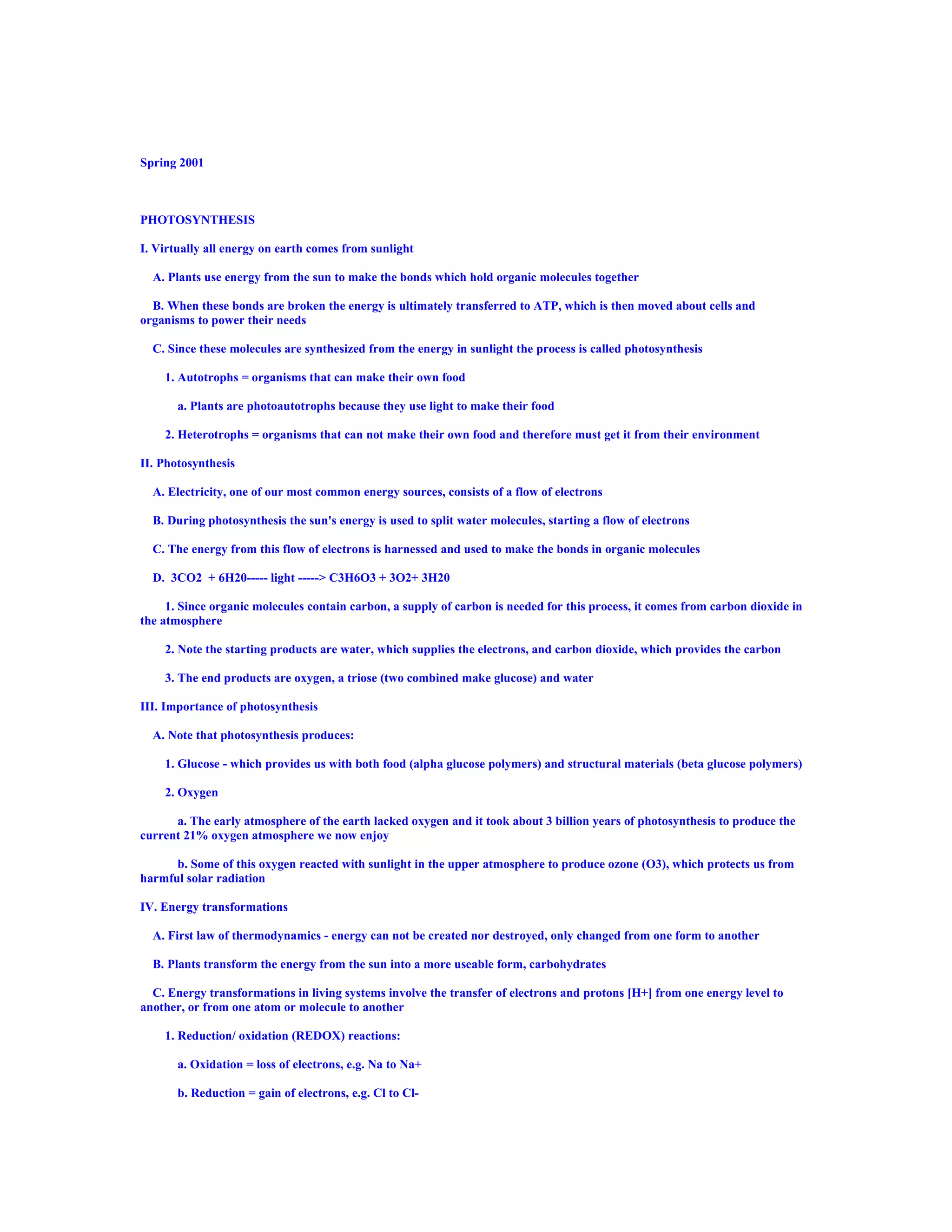 1. Photosynthesis converts the sun's energy into chemical energy that powers life on Earth. Plants use photosynthesis to produce glucose from carbon dioxide and water, releasing oxygen as a byproduct.