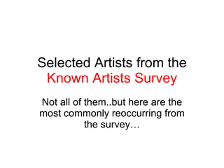 The document lists over 50 artists and provides details about some of their most famous works. It includes brief biographies and descriptions of artworks from seminal figures across different eras and genres, such as Andy Warhol, Pablo Picasso, Leonardo da Vinci, Michelangelo, Vincent van Gogh, Donatello, Raphael, Claude Monet, Edvard Munch, Salvador Dali, Georgia O'Keeffe, Jackson Pollock, Norman Rockwell, Frank Lloyd Wright, Frederic Remington, Chuck Schulz, Bob Ross, and Rembrandt. The works described span mediums including painting, sculpture, architecture, and graphic arts.