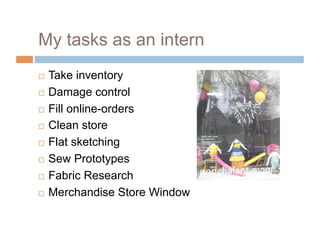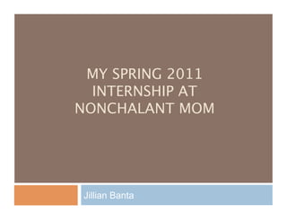 Jillian Banta interned at Nonchalant Mom in Spring 2011. Her tasks included inventory, filling online orders, cleaning the store, sketching designs, sewing prototypes, researching fabrics, and merchandising the store window. She created prototypes of a children's tunic, children's pantsuit, women's pantsuit, and women's halter top. For the prototypes, she adapted existing patterns, added elements like sashes and ties, and included details from the Nonchalant Kids line.