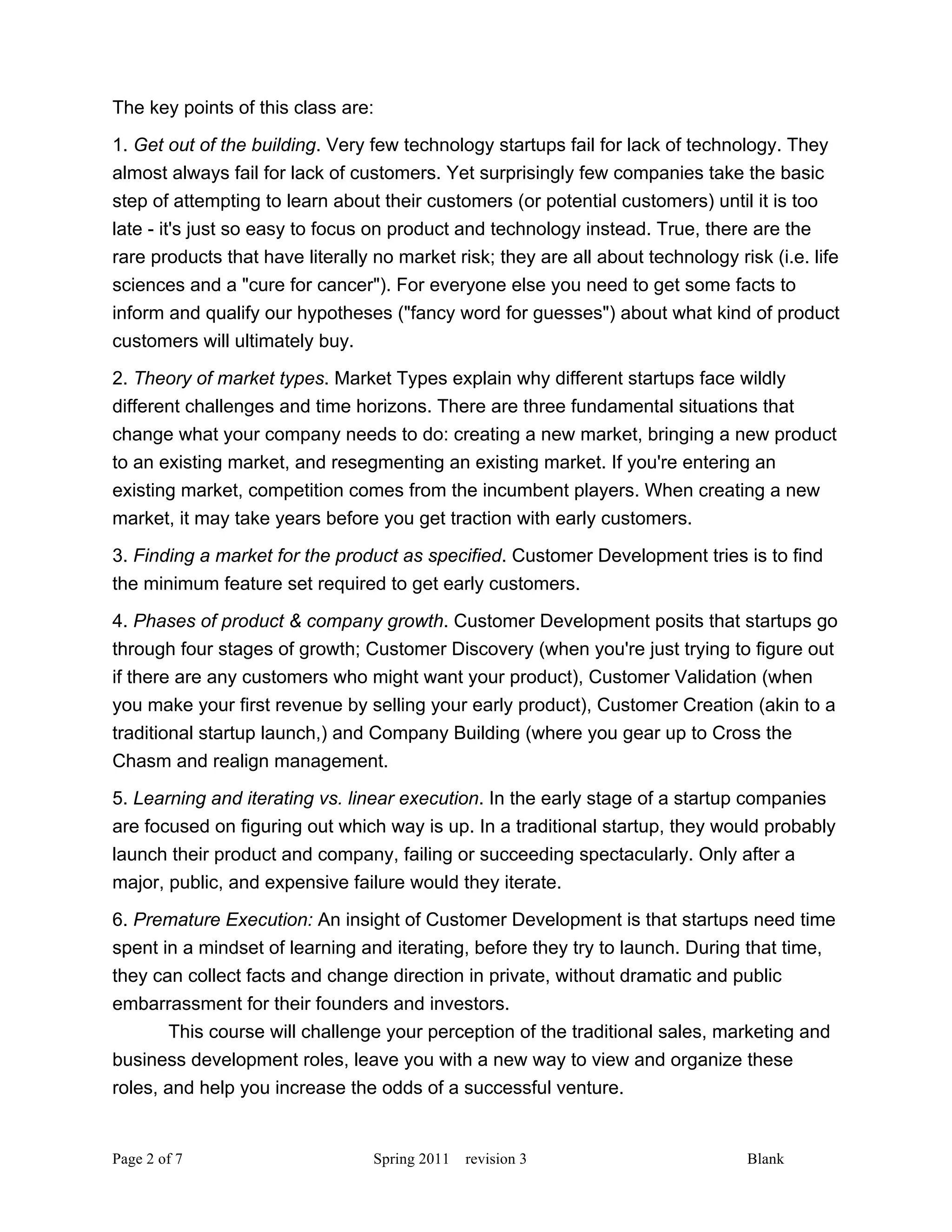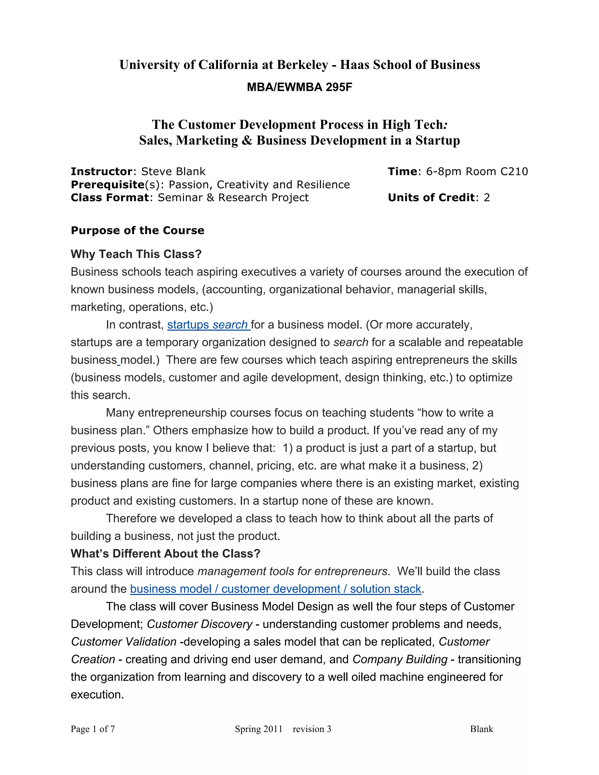 This document outlines a course on customer development for startups taught at UC Berkeley's Haas School of Business. The course introduces tools for entrepreneurs and covers business model design, customer discovery, validation, creation, and company building. It challenges traditional views of sales, marketing, and business development roles. Students complete application exercises analyzing companies' business models and customer development processes. They also conduct a team research project interviewing founders about their experiences with customer development. The goal is to teach students how to search for a scalable business model by getting customer feedback, rather than focusing only on products.