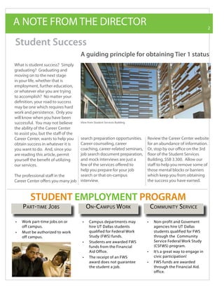 The document summarizes career-related resources and opportunities available through the UT Dallas Career Center. It discusses how displaying leadership skills is important for job seekers, provides tips for communicating leadership abilities to employers. It also highlights student success services, part-time job programs including federal work study, the new Delta Epsilon Iota honor society chapter, and the externship program which allows students to job shadow professionals during spring break.