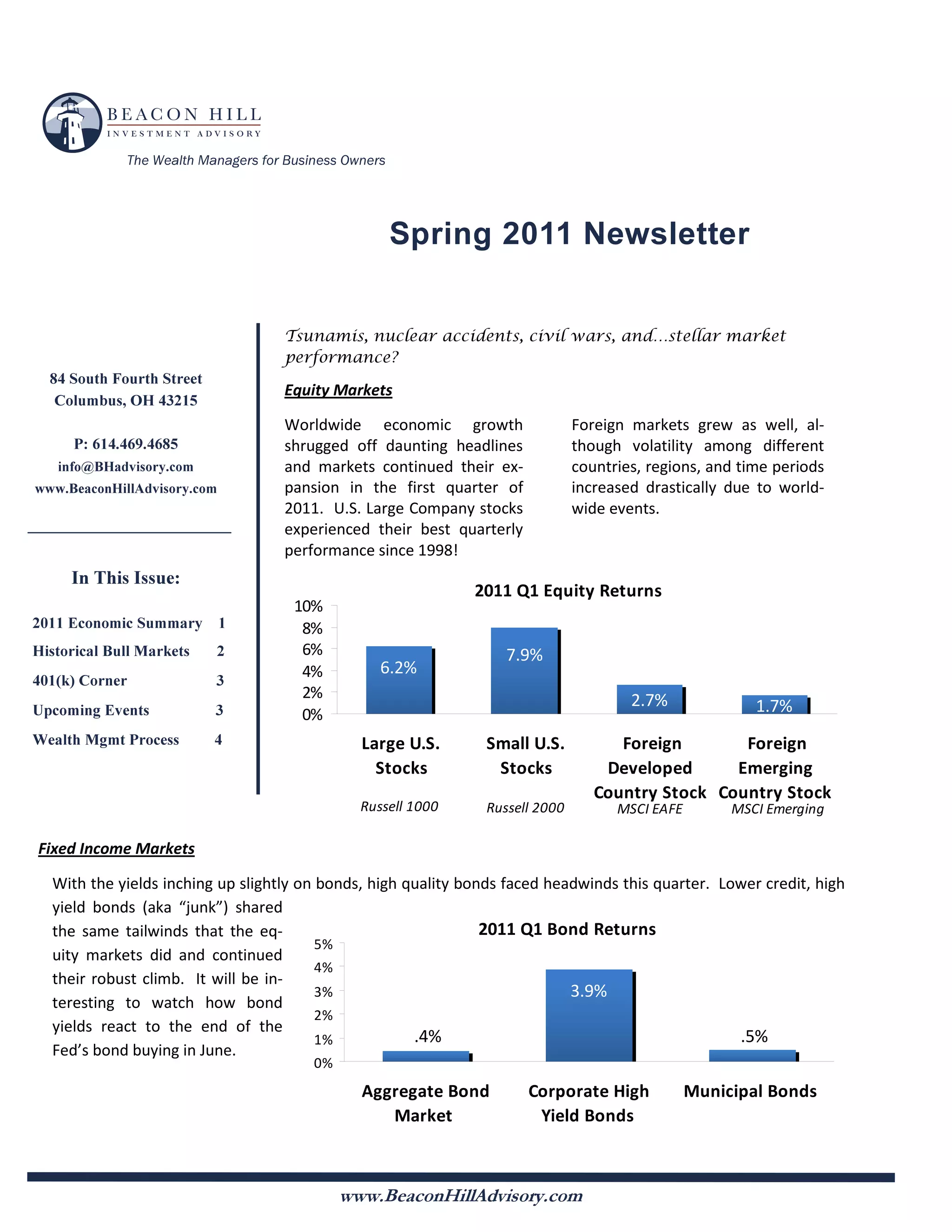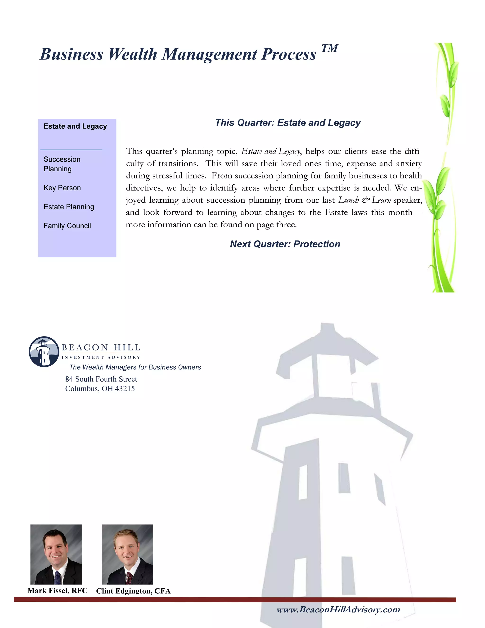 The document summarizes the Wealth Management Process quarterly newsletter. It discusses estate and legacy planning topics that help clients ease difficult transitions. It also covers succession planning for family businesses and identifying areas where further expertise is needed. The next quarter's topic will be on protection planning.