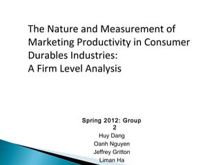 The document discusses developing a concept of marketing productivity, how to measure it using ratios of marketing output to input, and establishing benchmarks by considering factors like relative market share, price, number of competitors, product changes. It develops a marketing productivity index model using consumer durables firm data and validates it can also apply to nondurables industries.