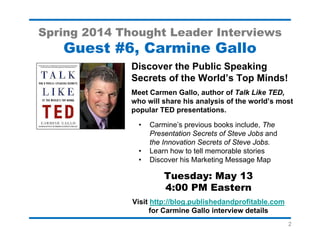 The document outlines a series of Spring 2014 thought leader interviews featuring prominent authors and experts like Richard Bolles, Dan Roam, and Joe Pulizzi, focusing on their latest works and insights into creativity, marketing, and presentation skills. Each entry provides details about the guests, their backgrounds, and the topics they will discuss, along with information on when to tune in for the interviews. These guests share productivity tips, strategies for success in writing and business, and innovative ways to engage audiences.