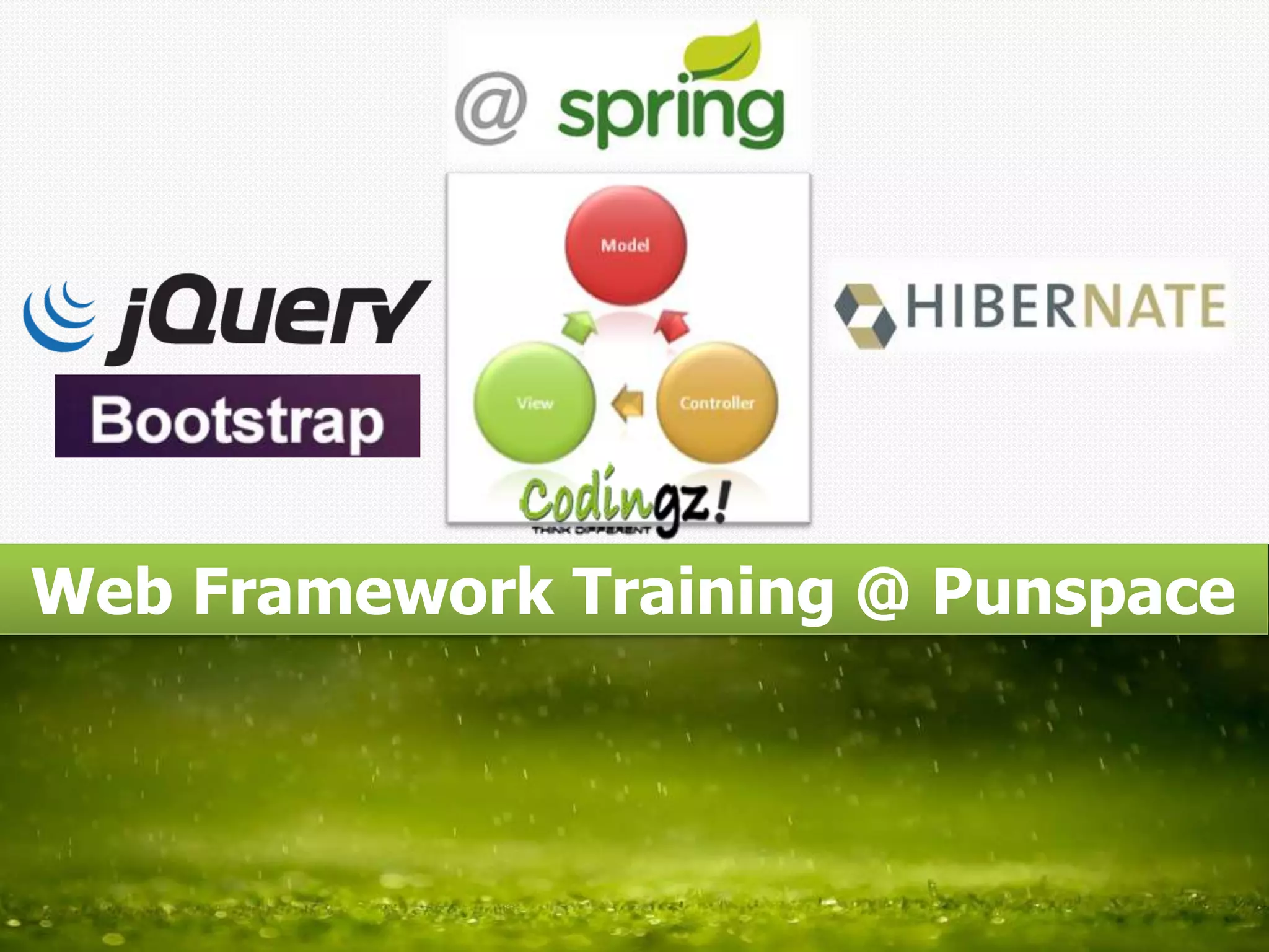 This document provides information about a web framework training course at Punspace. The training will cover the Spring framework, including what Spring is, its features like dependency injection and inversion of control, how it supports developing Java applications and web applications using the MVC framework. Attendees are instructed to register for the training tomorrow from 10am to 5pm at Coding Studio's website.
