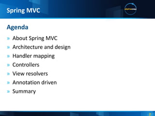 3. Controllers handle requests and return a model and view, with the view resolver determining how to render the view. Annotations allow specifying request mappings and other configurations.