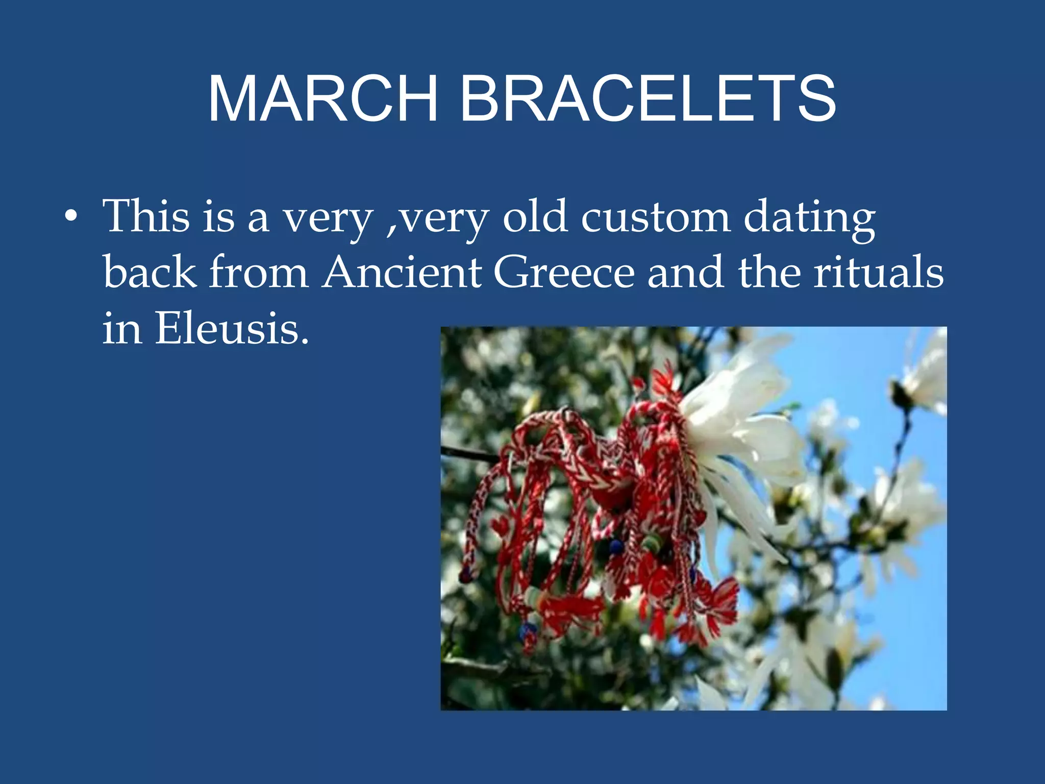 This document discusses an old Greek tradition where children are given bracelets on the first day of Spring to prevent sunburn. The bracelets are typically made from red and white wool by mothers or teachers. According to an old saying, the sun in March is so strong that it can tan skin for 5 months. The tradition also holds that children should wear the bracelets until the end of March and then leave them on flower pots so that swallows can use them in nest building. The school wishes to welcome Spring 2013 by sharing this cultural tradition.