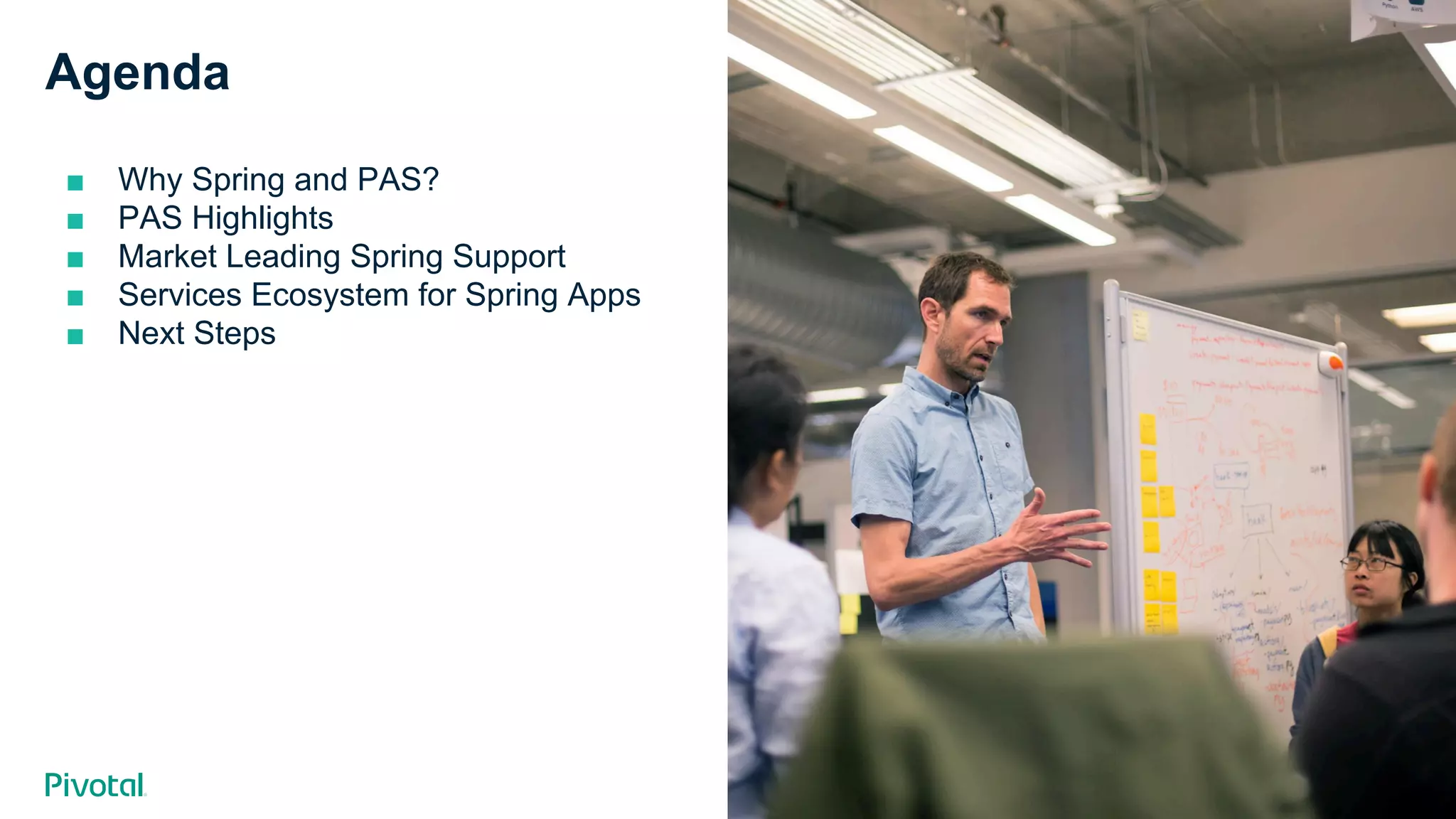Spring and Pivotal Application Service (PAS) provide a market-leading platform for developing and deploying Spring applications on cloud-native technologies. PAS offers robust support for Spring technologies, a growing ecosystem of services for Spring apps, and tools to improve development productivity and application observability. Next steps include contacting an account team, trying hosted PAS, or signing up for the next product roadmap call.